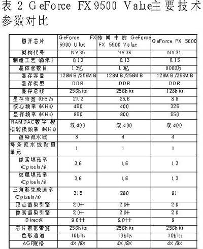 从表1中的数据可以看出,Radeon9800 SE这位“新星”与Radeon 9800 PRO之间的性能差距是巨大的。而除了显存频率略高,它与处境尴尬的Radeon 9600技术参数倒是非常的接近。而且现在市面上几乎所有的Radeon 9600显存都能超到500MHz频率,那么在同为8GB/s的显存带宽下,这两者之间几乎就看不出任何区别了。从这些对比来看,与其说Radeon9800 SE是Radeon 9800 PRO的低端降频版本,不如说它是Radeon 9600的增强版本来得合适。老实说,笔者也对ATi公司推出这样的新产品感到相当费解。除非Radeon 9800 SE也能像其前辈Radeon9500一样具备可修改为Radeon9500 PRO甚平是Radeon 9700的“优良品质”,否则其购买价值实在有限。不过从ATi狠心干掉大受欢迎的Radeon 9500系列来看,这种情况发生的可能性趋于零。也许是回为其竞争对手GeForce FX 5900Value尚未在中国零售市场出现吧!按照NVIDIA的销售策略,GeForce FX 5900 Value将主要出货给OEM PC厂商,但是也会有部分GeForce FX 5900 Value显卡流向零售市场。只不知道正式出现在零售市场上的GeForce FX 5900 Value规格会是如何,会不会也是128hit显存位宽的“阉割版”?