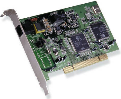 和56Kbps小猫一样,ADSL Modem(也称大猫)也有内置式、USB接口和以太网接口三种方式可供选择。其中内置方式采用PCI接口(图2),价格是三种方式中最经济的,但缺点也很明显:容易受到机箱内各种设备的电磁干扰,性能和稳定性不佳;功能单一,不带路由功能,只适合于一般的应用;另外在安装调试上也麻烦一些,适合那些想体验宽带魅力但预算又十分有限的用户。