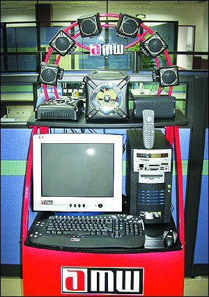 amw的机器战警(如图)强调游戏功能,配了比一般的5.1环绕立体声家庭影院还高的7.1声道数码声卡和豪华数字音箱,再加上双模式鼠标和有48个快捷键的智能型键盘,让游戏效果更佳。