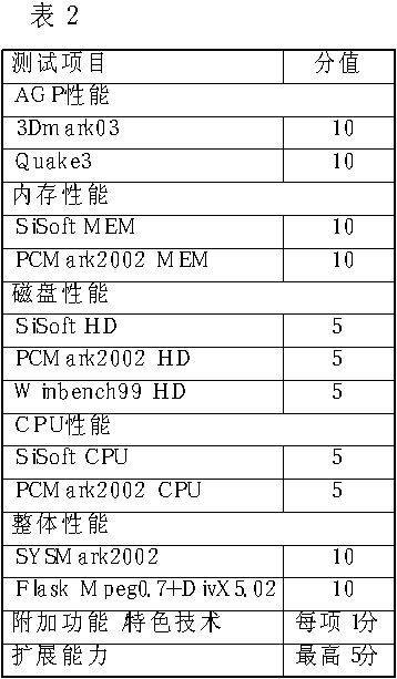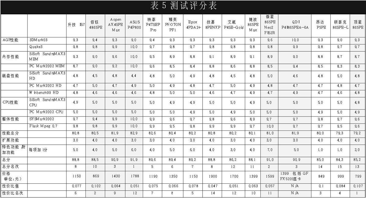 说明:扩展功能方面,我们对主板的附加功能和扩展能力进行评估,而且主板的特色功能也成为打分的参考。附加功能每项加2分,特色技术每项加两分。扩展能力总分5分,标准5PCI+4DIMM为3分,PCI数量超过此标准加1分,DIMM超过此标准也加1分。本次将只对性能测试总分排前十名的产品进行文字介绍。本次测试我们将对性能总分(包括附加功能和特色技术的分数)前3名、性价比前2名的产品进行颁奖,性价比直接由性能总分与价格相除得到。测试成绩和评分结果见表4和表5。