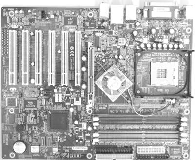 PHOTON PF1是精英向高端主板市场发出强劲攻势的先头部队之一,PHOTON PF1的做工和元件的选择与精英以前注重性价比的产品不太相同,已经具备了更高的水准,PCB方面还是采用了精英一贯使用的紫色调,整体布局看起来整齐、合理,CPU采用三相回路供电,双通道DDR插槽根据分组不同用不同颜色隔开,方便用户辨别。北桥上安装了漂亮的炫彩风扇,在运行时发出不同颜色的灯光,十分抢眼。