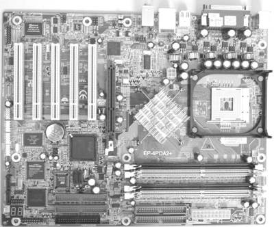 磐正 4PDA2+是EPox推出的i865PE主板中的高端型号,主板还是继承了磐正一贯的风格,使用了绿色的PCB板,整体做工严谨、细致,用料实在,看起来比较大气。CPU部分仍旧采用三相回流供电,主板上的DEBUG灯已经成为磐正主板的象征性标志。用户只要对照说明书,就可以在系统不能启动时通过DEBUG灯显示的信号来判断故障所在,再也不用碰运气插拔板卡来找故障原因了,非常方便。