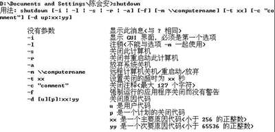 上述功能的实现都是使用“Shutdown”命令实现的,shutdown的参数表如图2所示(在命令行窗口中输入“shutdown”即可显示)。笔者认为最有用的是“-i”参数,可以调出“远程关机对话框”,能方便地实现局域网内计算机的远程关机,有兴趣的朋友可以试一试。
