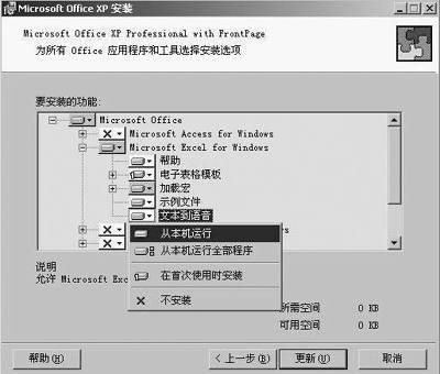 在Excel 2002中使用“文本到语音”功能,必须要进行安装,因为“文本到语音”功能并不是缺省安装的。打开“控制面板”,双击“添加/删除程序”,找到“Microsoft Office XP Profesional with FrontPage”项,点击“更改”按钮,系统经过一段时间的系统配置后,显示出“维护模式选项”。选择第1项“添加或删除功能”,点击“下一步”,显示如图1所示。按图示位置找到“文本到语音”选项,单击选项名左边的小三角,在弹出的菜单中选择“从本机运行”,最后单击“更新”按钮,系统就会开始自动安装,此时有的系统可能会提示插入Office XP的安装光盘。