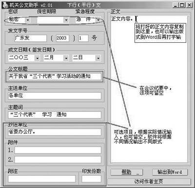 如图所示,这里可以选择密级、保密期限、紧急程度等不同级别,再键入发文字号、签发人、成文日期、公文标题、主送单位、主题词、抄送单位、附件、附注、印发份数等内容,只要对号入座就行了,没有的项目当然不用输出。