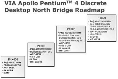 VIA和Intel的“战争”结束,意味着VIA支持Intel P4处理器的芯片组有了合法身份。为了更多、更快地抢占800MHz FSB P4芯片组市场,VIA相应地也修改了自己的芯片组发布计划(图1),而且将原来的P4芯片组PT400、PT600和PT800集体更名,新的芯片组名称分别为PT800、PT880和PT890,三个芯片组中PT800支持单通道DDR400内存和800MHz FSB,PT880支持双通道DDR400内存和800MHz FSB,而PT890则支持DDRⅡ、800MHz FSB和PCI Express。对应集成显卡的芯片组则是PM800、PM880和PM890。PT800已于7月8日推出,PT880将于今年秋季推出,而PT890则定于明年年初上市。