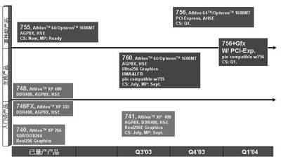SiS在7月8日发布了支持K8处理器的芯片组SiS755。SiS755采用了HyperStreaming引擎,支持AGP 8×,与南桥之间的连接采用了“MuTIOL 1G”技术,能使数据平稳地传输。南桥芯片组为SiS964,支持并行ATA、S-ATA,支持8个USB2.0插口、RAID功能(0/1/0+1和JBOD)。第三季度会推出集成芯片组SiS760,年底将推出支持PCI Express的756芯片组,明年第一季度量产(图2)。