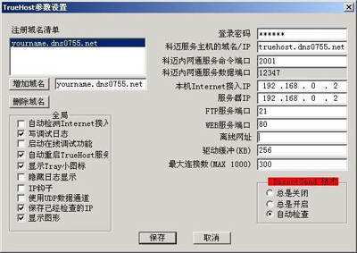 1.在科迈网免费注册一个账号和一个域名,如:yourname.dns0755.net。安装TrueHost,并做好相应配置(图1),具体安装步骤在科迈网上有详细说明。这里需要注意的是TrueHost目前只支持Windows 2000、Windows XP和Windows 2003,所以,只有安装这些操作系统的微机才可以被远程控制,外网的客户机倒没有什么限制。