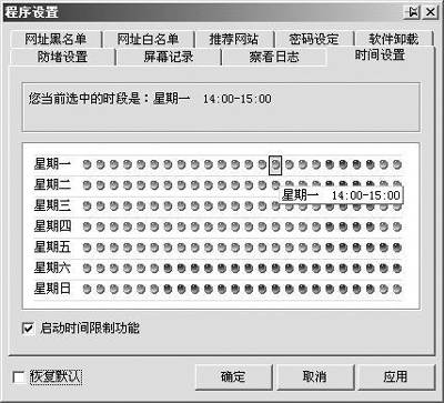 时间设置:进入“时间设置”选项卡,灰色按钮表示不可上网时段,蓝色为可上网时段,首先复选“启动时间限制功能”,然后可通过在按钮上单击鼠标来设置上网时段,当鼠标从按钮上滑过时,可显示出按钮对应的具体时段(图2)。