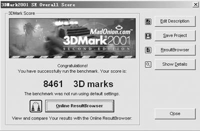 这个项目主要测试的是显卡的性能,联想锋行A9010电脑的定位是家庭用户,因此,3D游戏性能测试是非常必要的,特别对于家庭用户来说,游戏功能可是这台电脑的主要用途。我们将游戏的分辨率设定在主流的1024×768@16bit下,刷新率设定在85Hz下。选取3Dmark2001 SE所有的测试选项,测试程序跑出来的最好成绩为8461(在进行了系统整理与系统重新启动的基础上,图3)。