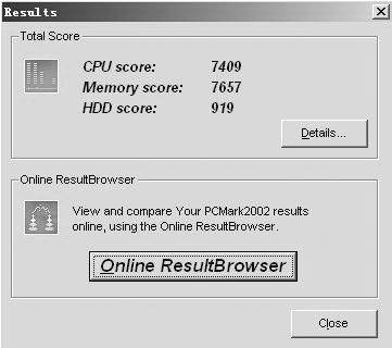 在这部分测试中,测试的是这台机器的CPU、内存、硬盘性能,其中,CPU部分的成绩为7409,内存部分的成绩为7657分,而硬盘部分的成绩为919(图4)。其中特别要指出的是,在与其他电脑部件配置相同的情况下,联想锋行A9010电脑的内存部分测试成绩是突出的,双通道DDR内存的力量果然强劲。另外要提一下的是硬盘部分的成绩也比较突出,普通80GB/7200转硬盘的成绩通常在700多。