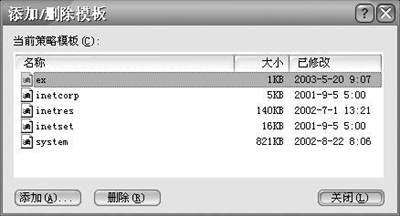 首先运行“组策略”程序,然后选择“计算机配置”或者“用户配置”下的“管理模板”,按下鼠标右键,在弹出的菜单中选择“添加/删除模板”,则弹出如图1所示的对话框。