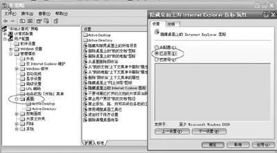 比如要隐藏桌面上的“网上邻居”和“Internet Explorer”图标,只要在右侧窗格中将“隐藏桌面上‘网上邻居’图标”和“隐藏桌面上的Internet Explorer图标”两个策略选项启用即可(如图);如果隐藏桌面上的所有图标,只要将“隐藏和禁用桌面上的所有项目”启用即可;当启用了“删除桌面上的‘我的文档’图标”和“删除桌面上的‘我的电脑’图标”两个选项以后,“我的电脑”和“我的文档”图标将从你的电脑桌面上消失;同样如果要让“回收站”图标消失,只需将“从桌面删除回收站”策略项启用即可。