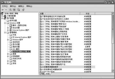 如果觉得Windows的“开始”菜单太臃肿的话,可以将不需要的菜单项从“开始”菜单中删除。在组策略右侧窗格中,提供了“从开始菜单删除用户文件夹”、“删除到‘Windows Update’的访问和链接”、“从开始菜单删除公用程序组”、“从开始菜单中删除‘我的文档’图标”等多种组策略配置项目。你只要将不需要的菜单项所对应的策略启用即可。
