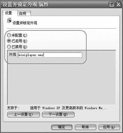 启用此策略后,将使Windows Media Player只以指定的外观模式显示,具体可以使用在“策略”选项卡上的“外观”框中指定的外观(如下图所示)。你必须为外观使用完整的文件名(例如miniplayer.wmz)。如果外观文件在用户的计算机上没有安装,播放器将以Windows Media Player外观打开。