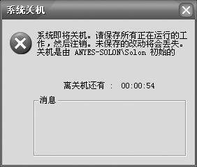 这时,在Anyes-solon计算机的屏幕上将显示一个“系统关机”的对话框,在对话框下方还有一个计时器,显示离关机还有多少时间(如下图所示)。在等待关机的时间里,用户还可以执行其他的任务,如关闭程序、打开文件等,但无法关闭该对话框,除非你用shutdown -a命令来中止关机任务。