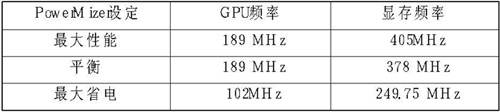 它的运作方式和SpeedStep类似,有了这项功能之后, GPU核心和显存频率可以根据需求作动态调整。使用者可以通过更改设置来决定是以低电池寿命换取最大显示性能,还是以低显示性能(低画面速率和填充率)来换取最长电池寿命。PowerMizer功能对GPU和显存频率的影响如下表: