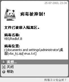 金山毒霸:主程序:2003.7.11.153 查毒引擎:2003.07.10 病毒库:2003.7.23