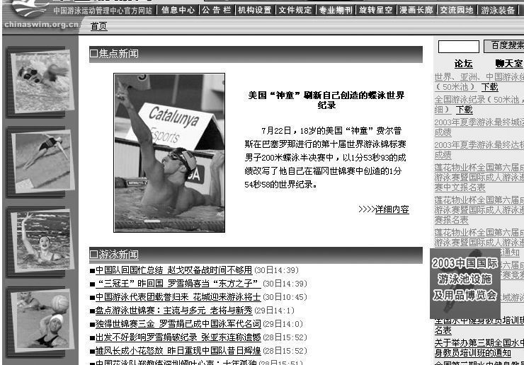 2003年世界游泳锦标赛刚刚结束,“国际游泳联合会”(http://www.fina.org)(英文)自然是我们了解世锦赛信息的网站。这里能看到比赛的许多相关图片、文字。各国的战绩都在这里有报道。每天的新闻都做成了PDF文档,并可以快速查找第N天的新闻。