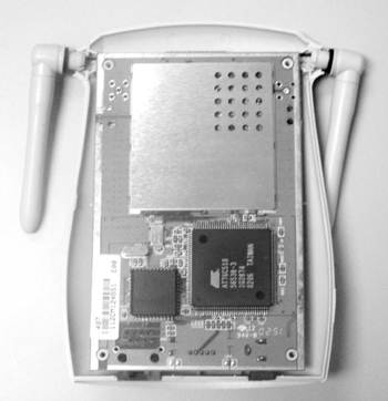 AP的内部构造是什么样子呢?图2是拆下外壳的无线AP,上面靠近天线的部分是一块金属片,用于屏蔽外部的干扰源,有利于信号的发射和接收;下面是一块处理无线数据的主芯片。