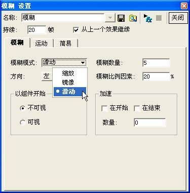2.单击工具栏上的“插入图像”按钮,将“back.gif”图片插入到场景中,用鼠标将它拖至场景的右下角。选中该图片,用鼠标单击时间轴的0帧处,选择“添加效果→模糊”,设定“模糊模式”为“滑动”,其他不变,关闭对话框(图1)。
