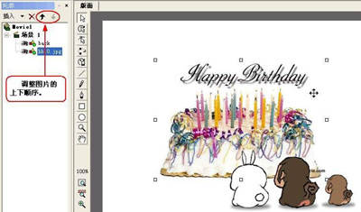 6.单击工具栏上的“插入图像”命令,插入“gift.jpg”,在场景1中,将它调整到所有图像的下面,然后在第30帧处“插入效果→滑入→从左”。
