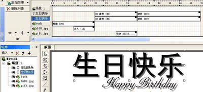 4.单击“插入→文本”,新增一个文本物件“生日快乐”,在右侧的文本设置中,设置字体为“华文细黑”,大小为100,粗体,黑色,并将它拖到场景的顶部。
