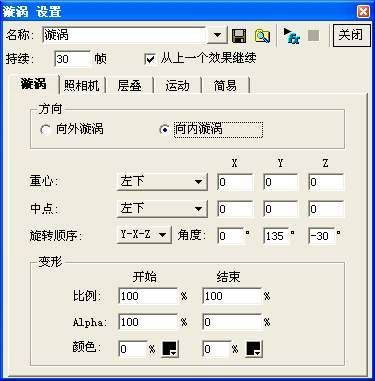 10.在时间轴第70帧处“添加效果→漩涡”,设定漩涡的方向为“向内旋转”,重心和中点都为“左下”,这样,祝福的话语就像是从左下方的礼品盒中跑出来一样(图4)。