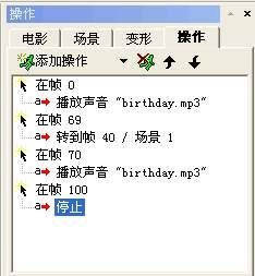 11.选取场景1,在时间轴的0帧处,“添加操作→播放声音”,导入“birthday.mp3”音乐,选择时间轴的69帧,“添加操作→转到帧”,“场景”=“场景1”,“数字”=“40”。(即到了69帧处,返回到40帧开始播放。)在70帧处,“添加操作→播放声音”,选取“birthday.mp3”,在影格100帧处“添加效果→停止”(图5)。