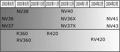 在今年底,NVIDIA在发布NV40的同时,还将推出PCI Express版本NV36x和NV37x。NV40将同时有AGP 8×和PCI Express两个规格,采用0.13微米工艺,最多将集成2亿个晶体管,很可能集成12条像素渲染管线,同时搭配12个纹理贴图单元,同样也有Ultra和非Ultra版本之分。NV40将搭配256位DDR2显存,3D性能至少将比GeForce FX 5900 Ultra提升30%。