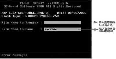 首先做一张没有CONFIG.SYS和AUTOEXEC.BAT的DOS引导盘,再把BIOS更新程序如AWDFlash和BIOS数据文件拷到引导盘,然后在引导盘中建立AUTOEXEC.BAT文件,其内容为:“AWDFlash XXX.BIN /SN /PY”(XXX.BIN是你的BIOS数据文件)。其中的/SN /PY参数表示不备份自动更新BIOS。把系统中无关的板卡和硬盘线拔下,只保留软驱,插入此盘后重新启动,系统会“自动”更新BIOS,等数分钟后再重新启动,一般BIOS就可以恢复了。