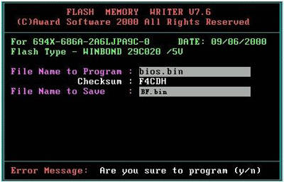 再次执行AWDFlash.exe这个软件,在“File Name to Program”框中输入刚下载回来的新的BIOS程序的文件名(如BIOS.bin)后回车,程序会询问是否需要备份原有BIOS,这时选择“Y”,并在“File Name to Save”框中输入一个保存主板BIOS的文件名(如:BF.bin),以便在BIOS刷新失败时进行挽救,按回车备份结束后,系统会询问是否继续(图2),按“Y”,等待一段时间后,待进度条全部走完,系统便会提示写入成功,到此就大功告成了(图3)。