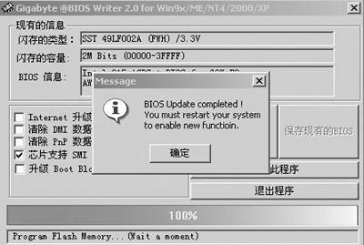 点击“升级新的BIOS”按钮,并在弹出的窗口中选择要刷新的BIOS文件,然后在弹出的消息框上点击“确定”按钮确定刷新,便会自动为你刷新BIOS,此时下方将会出现刷新进度条,整个操作在Windows下进行,持续的时间约为10秒钟,刷新结束后程序会弹出消息框,提示你升级成功,并要求重启计算机(如图5)。