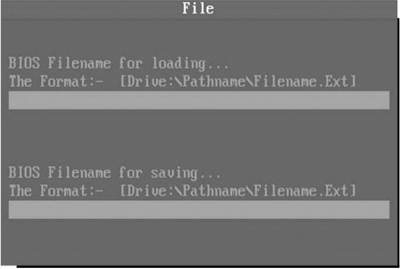 用方向键把光标移到“FILE”项,回车后(如图10),上面是加载BIOS文件,下面是保存现有BIOS。输入要刷新的那个BIOS文件的路径,按回车键,程序将自动开始升级操作,待操作完毕后,退出该程序,就大功告成了!