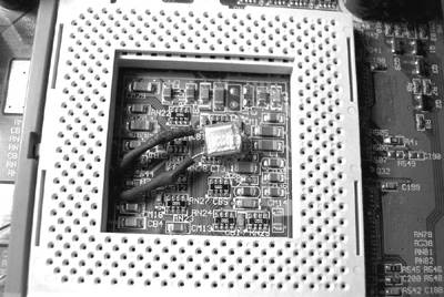 选择合适的细导线是最大的难题。经过多方寻找,终于在废弃的小型变压器内找到了细导线──包有绝缘漆的漆包线,这可是好东西,由于表面是绝缘的,不会造成CPU引脚短路而引起故障,而且线径可以选很细的,各方面都符合要求!