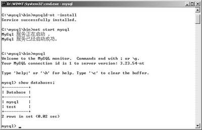 打开MS-DOS界面,进入C:\MySql\bin目录,在提示符下输入“mysqld-nt -install”。