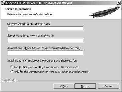 执行安装程序后会出现Server Information窗口(如图2),在“Network Domain”处输入域名(如无合法域名则输入本机IP地址);“Server Name”处输入你的服务名;“Administrator's Email Address”输入管理员的邮箱地址;两个单选项使用默认选择。点击“Next”,指定安装到C:\Apache目录下完成安装。