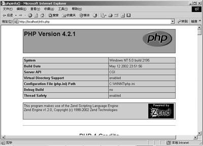 运行Apache,在浏览器中输入http://localhost/test.php,如果出现PHP的配置信息(图4),则说明一台支持PHP的Web服务器已经配置成功!