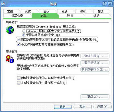 一些网络病毒总是试图在没得到许可的情况下,尝试着给OE(Outlook Express)通讯簿(或联系人列表中)的联系人发送含有病毒的邮件副本,为了避免病毒在网络中传播以殃及无辜的朋友,此时你可以让OE发出警告提示。方法是:选择“工具→选项”命令,在弹出的窗口中选择“安全”选项卡,确保“病毒防护”下面的“当别的应用程序试图用我的名义发送电子邮件时警告我”复选框处于勾选状态(见图)。