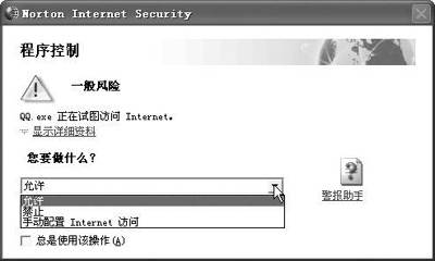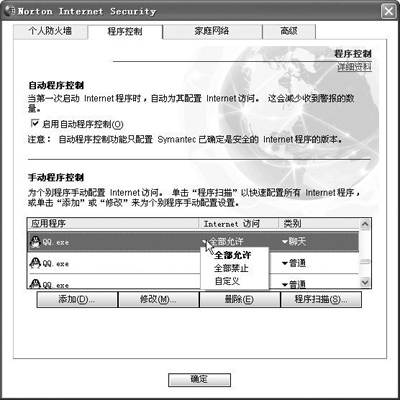 控制程序的Internet访问权限是诺顿防火墙采取的主要安全措施,这样可禁止本机中来路不明的程序访问Internet,保证了机器中的信息不被泄露。
