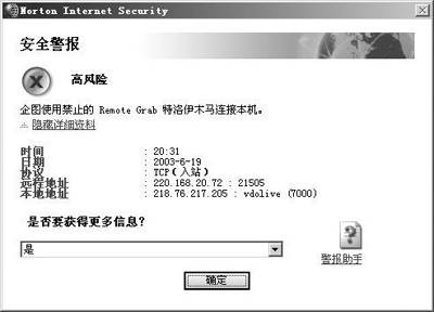 入侵检测是诺顿防火墙提供的另一个防护手段,它会对所有进出网络的信息进行扫描分析,查看它是否具有攻击特征,如果是就会立即禁止该连接,在系统托盘区的图标会不断闪烁发出警报,你可双击图标来查看安全警报。在弹出的“安全警报”对话框(图2)中会显示发起攻击的IP地址及攻击的方式。不过放心,诺顿防火墙已经自动禁止攻击者的IP与本机的连接,默认的禁止时间是30分钟。当然,你也可设置永久禁止某个IP地址或某个IP地址段与本机的连接,以免再次受到攻击。