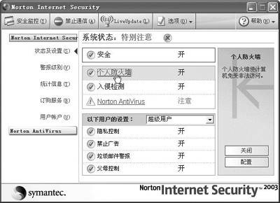 以上只是一些常用的设置,另外“Norton Internet Security”对话框中还有一些选项,可对“隐私控制”、“禁止广告”、“垃圾邮件警告”、“父母控制”等功能进行设置,其设置方法和“个人防火墙”差不多,而且大部分都可使用默认设置,所有这些功能结合在一起为你的电脑构筑了一整套严密的安全防卫体系。