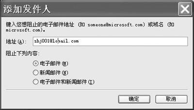 对于某些经常发送垃圾邮件,而且知道其邮件地址的发件人,可以采用“狙止发件人”操作来实现狙击垃圾邮件。在“邮件规则”设置窗口,单击“狙止发件人”选项,然后单击“添加”按钮,在“添加发件人”的地址框中输入垃圾邮件发件人的邮件地址,比如“shom_g_0_0_1@ex00.com”,最后单击依次确定按钮(如图2)。这样当收到从shom_g_0_0_1@ex00.com发来的邮件时就会自动转移到“已删除文件夹”中了。如果所收到的垃圾邮件都属于一个“域”的发件人,域就是跟在电子邮件地址“@”符号之后的名字,比如“ex00.com”,可以直接将域添加到阻止发件人名单中。