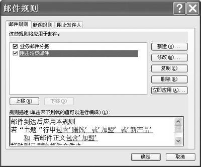 设置完毕后,依次单击“确定”按钮,这样在收到包含上述特定词语的垃圾邮件时,就会自动转移到“已删除邮件”文件夹了。实际上利用邮件规则功能,还能够实现自动回复、自动转发等,其操作方法和上面相似。