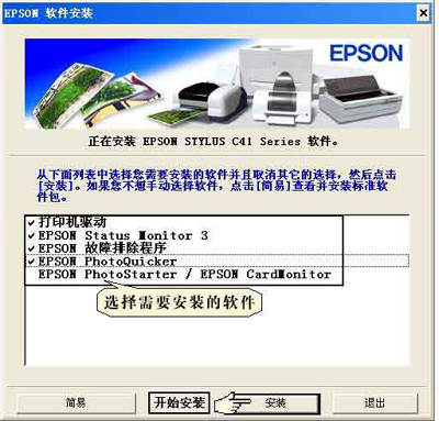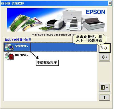 ②启动计算机进入Windows,将打印机驱动光盘放入光驱,随后弹出“EPSON安装程序”窗口(大多打印机配送的驱动光盘都会弹出安装程序窗口)。
