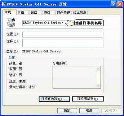 ④打开“打印机属性”对话框。在“常规”标签项的最上方的文本框中是当前打印机的名称。如果要测试当前打印机是否已经正确安装,可以单击“打印测试页”按钮,打印一张测试页,检测是否打印正常。如果不正常则我们需要重新安装驱动程序。