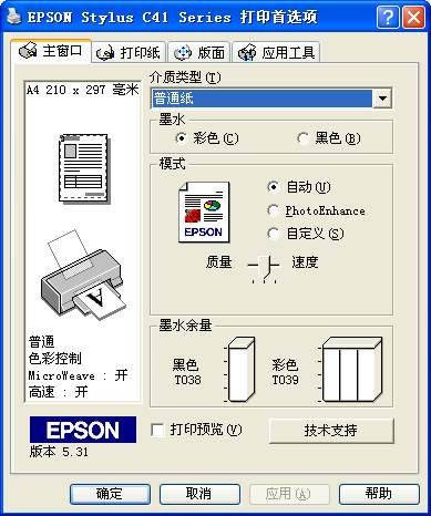 ⑦在“墨水”项中我们可以选择墨水的类型。如果经常打印文字文稿,可在此选择“黑色”墨水;如果需要打印的是彩色图片,则在此选择“彩色”墨水。