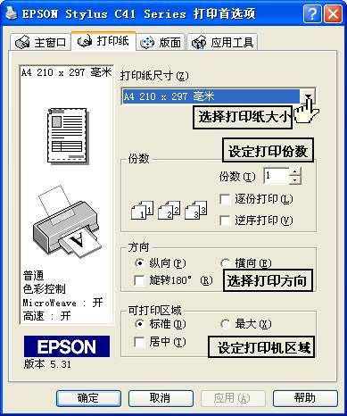 ⑥在“主窗口”中的“介质类型”选项中,可以根据打印机情况设置打印机的纸张来源,选择需要的纸张类型。