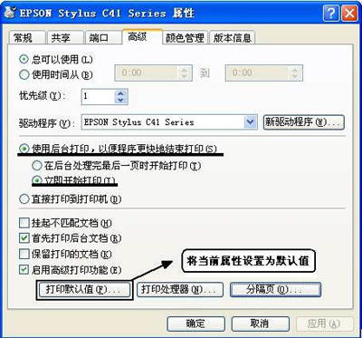 ⒁点选“高级”标签项,可以设置有关打印机的一些相关配置。选中“使用后台打印,以便程序更快结束打印”选项,这样在打印的同时不会影响我们做其他的事情。