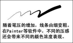 直观地说,就是手写笔在手写板上施于不同的压力,就会带来笔画粗细和色彩浓淡的差异(见图)。这种效果通常只体现在支持压感的图形软件中,最典型的就是Painter和Photoshop,而珠海优软的《精灵画笔》也支持压感功能。